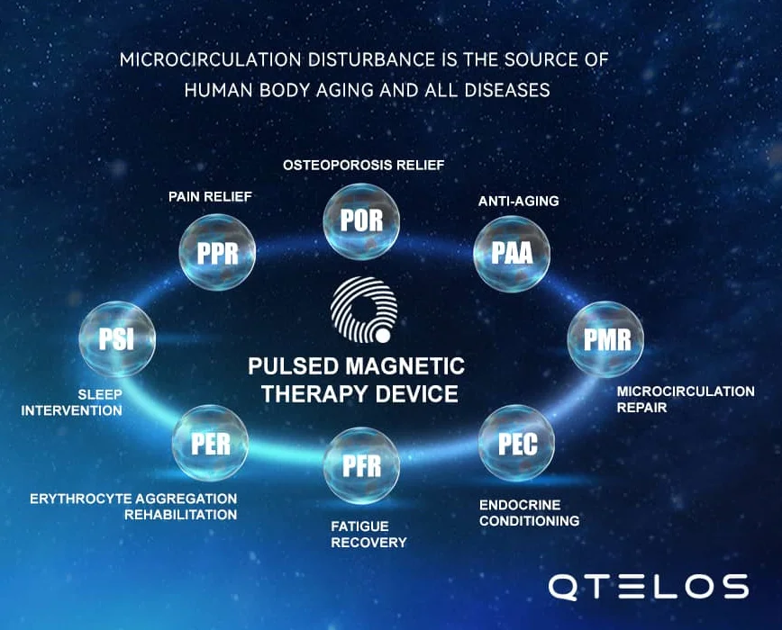 The QPMT (Pulsed Magnetic Therapy Machine) integrates advanced PEMF (Pulsed Electromagnetic Field) technology to offer a personalized health management program. With seven functions and eight intensity levels of the magnetic field independently selectable, it is designed to cater to a wide range of health needs. From rehabilitation of erythrocyte aggregation to pain relief and anti-aging, the QPMT serves as a comprehensive solution for preventing and managing chronic diseases, enhancing sleep quality, and improving overall well-being.